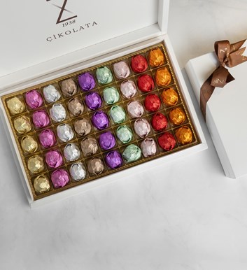 Yaldızlı çikolatalarımızın içeriği fıstık pral olarak üretilmektedir.
